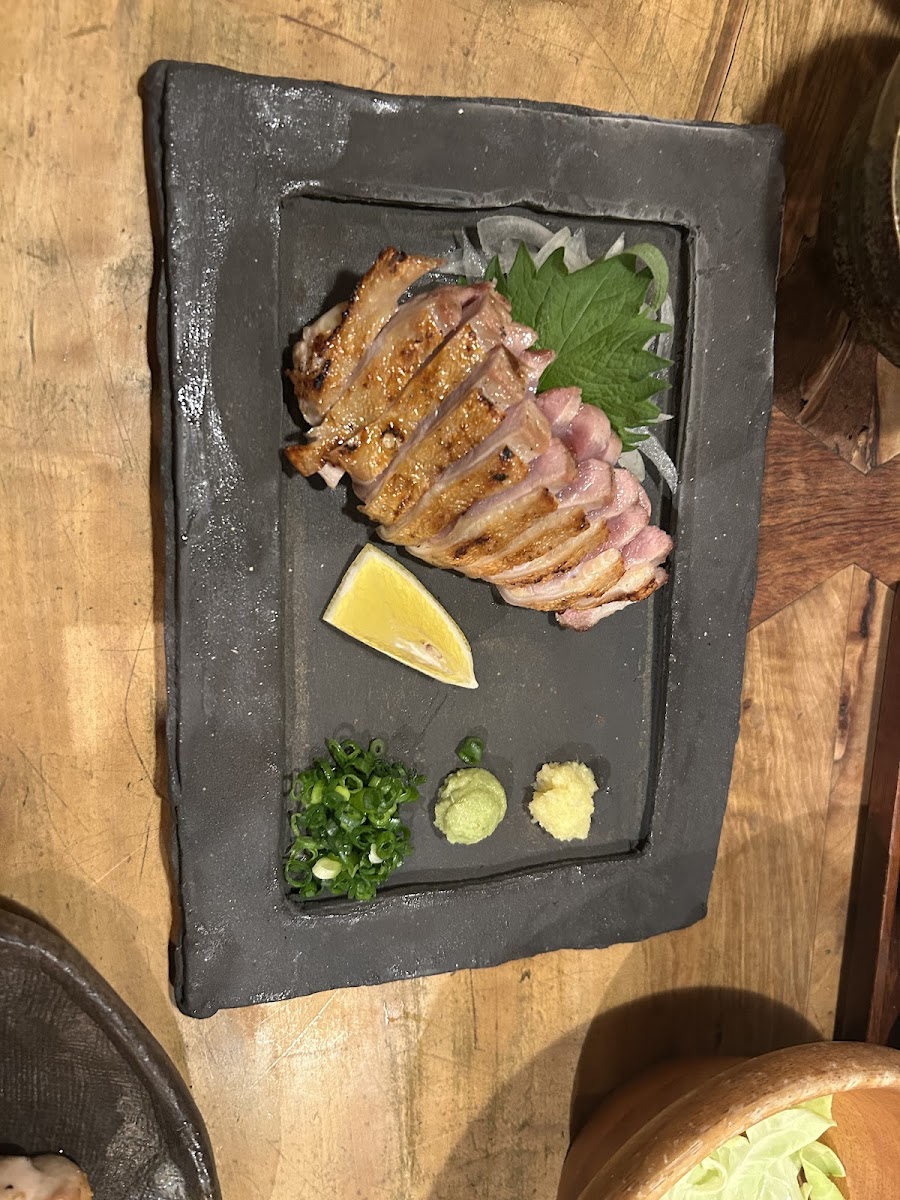 One of the standout dishes at Tori Tamura is the 丸腸ホルモン串 (Marucho Hormone Skewers). This delicacy is a true highlight, with tender and flavorful hormone skewers grilled to perfection, delivering an unforgettable taste. If you're in the mood for something a little different, the Duck Tataki offers a tantalizing option. The dish is served with just the right balance of smoky and savory flavors, a treat for those who appreciate fine meats.